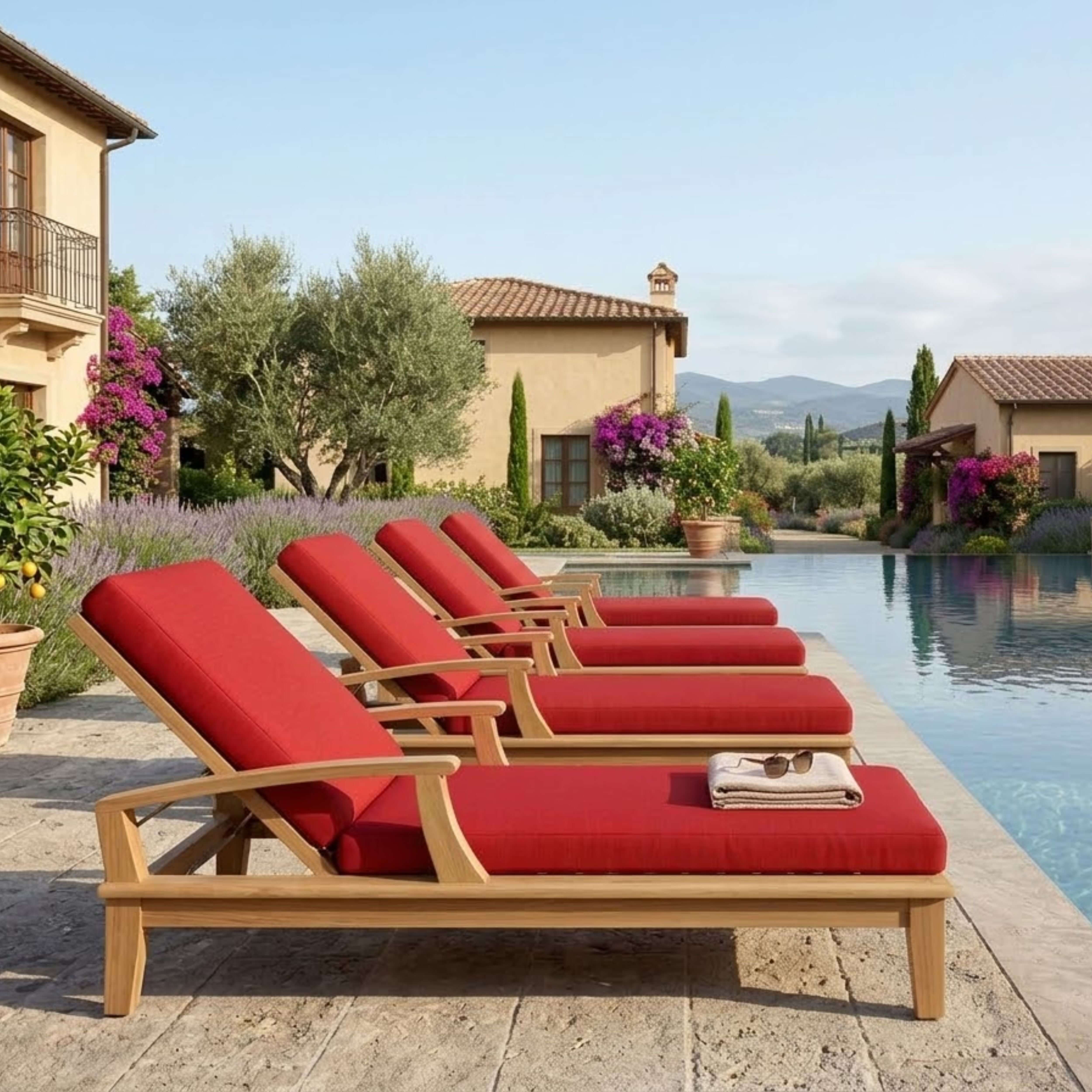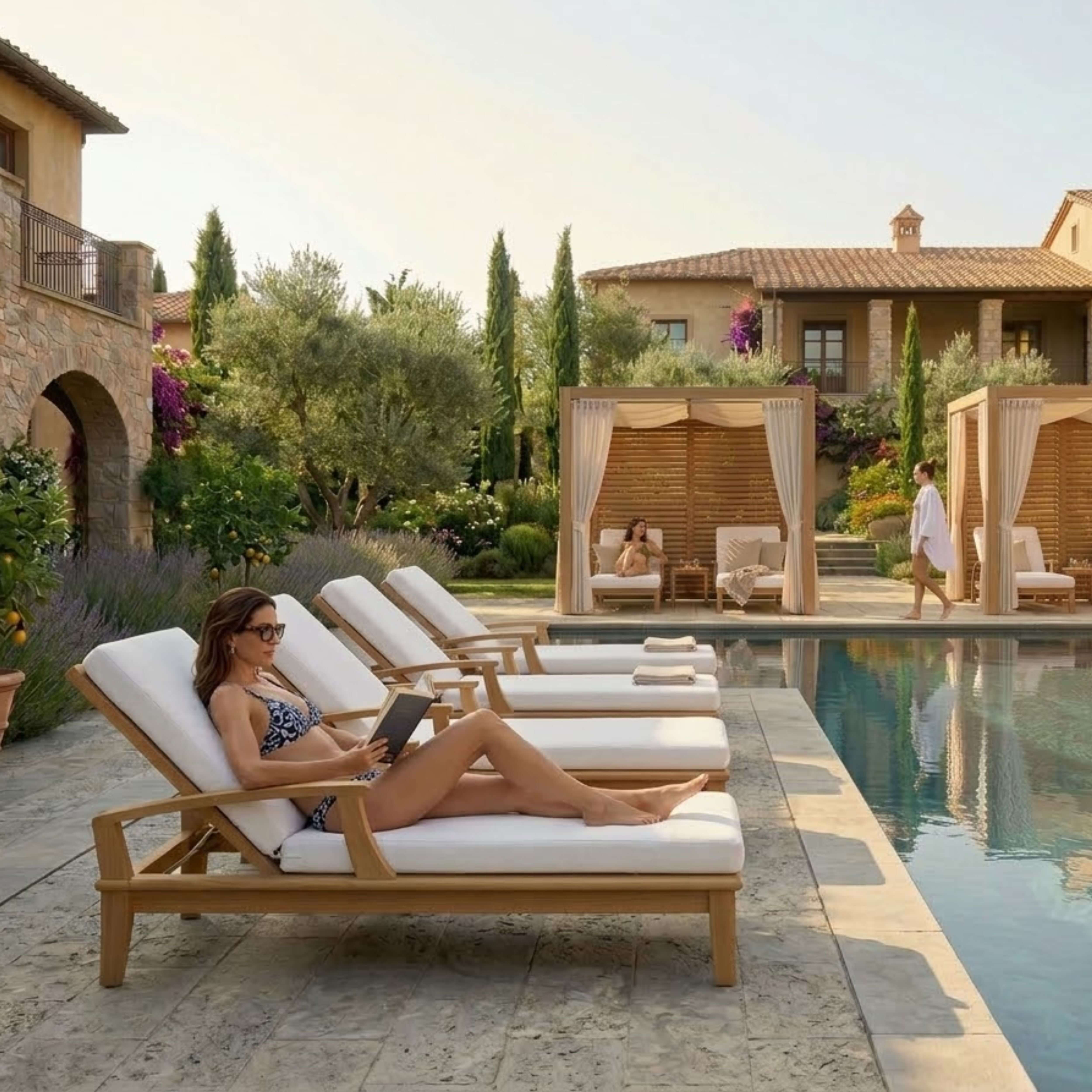 Our most popular piece, the Brianna Sun Lounger has been called by some, “The most comfortable Sun Lounger they have ever relaxed in”. Perfect for poolside reading in the sun. This Sun Lounger adjusts to four different positions, including completely flat. With its solid teak wheels, it can be easily moved in or out of the sun. Cushions are available and sold separately.